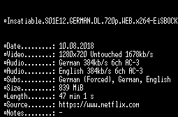 | FiLENAME: | Insatiable.S01E12.GERMAN.DL.720p.WEB.x264-EiSBOCK.mkv |