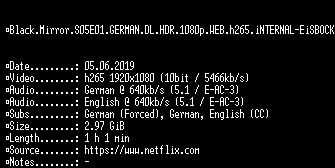 | FiLENAME: | Black.Mirror.S05E01.GERMAN.DL.HDR.1080p.WEB.h265.iNTERNAL-EiSBOCK.mkv |