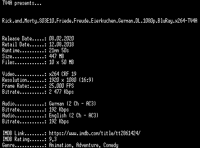 | FiLENAME: | Rick.and.Morty.S03E10.Friede.Freude.Eierkuchen.German.DL.1080p.BluRay.x264-TV4A.mkv |
