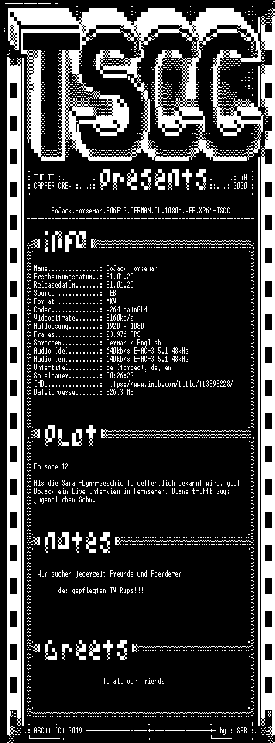 | FiLENAME: | BoJack.Horseman.S06E12.GERMAN.DL.1080p.WEB.X264-TSCC.mkv |