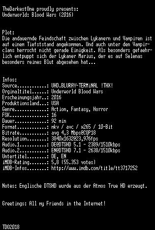 | FiLENAME: | Underworld.Blood.Wars.2016.German.DTSHD.DL.2160p.UHDBD.x265-TDO.mkv |