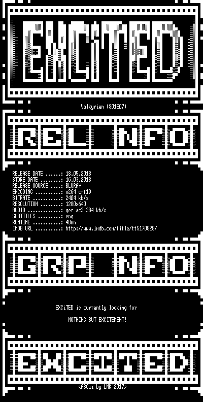| FiLENAME: | Valkyrien.S01E07.German.720p.BluRay.x264-EXCiTED.mkv |