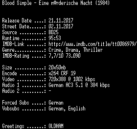 | FiLENAME: | Blood.Simple.Eine.moerderische.Nacht.German.REMASTERED.1984.AC3.BDRip.x264-SPiCY.mkv |