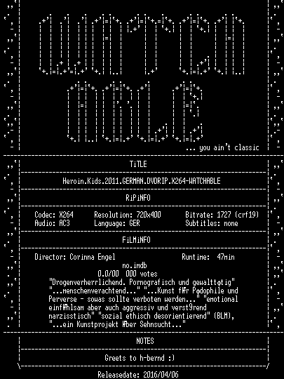 | FiLENAME: | Heroin.Kids.2011.GERMAN.DVDRIP.X264-WATCHABLE.mkv |