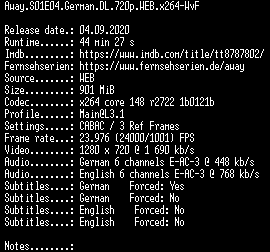 | FiLENAME: | Away.S01E04.German.DL.720p.WEB.x264-WvF.mkv |