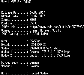| FiLENAME: | Viral.2016.German.DL.1080p.BluRay.x264.RERiP-SPiCY.mkv |