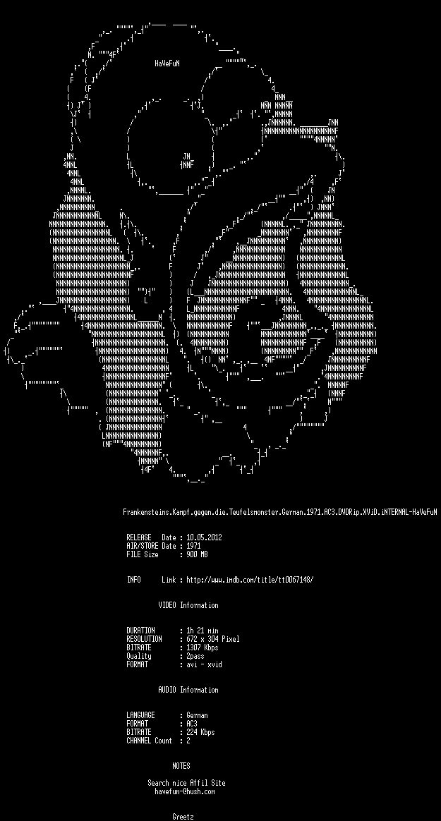| FiLENAME: | Frankensteins.Kampf.gegen.die.Teufelsmonster.German.1971.AC3.DVDRip.XViD.iNTERNAL-HaVeFuN.avi |