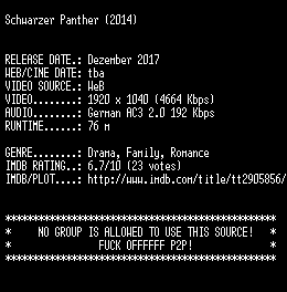 | FiLENAME: | Schwarzer.Panther.2014.German.WebRip.x264-SLG.mkv |
