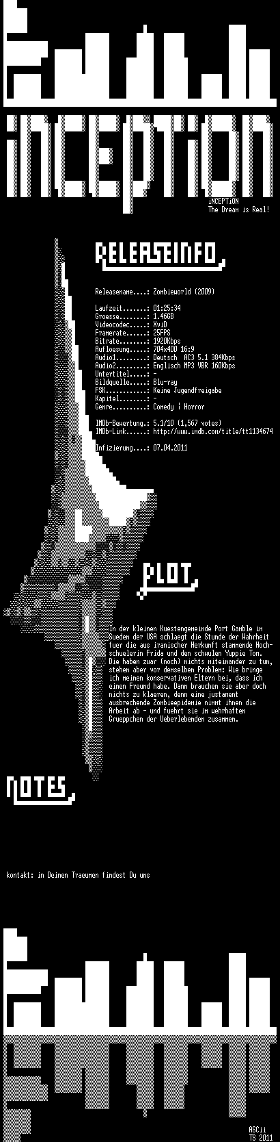 | FiLENAME: | Zombieworld.2009.German.AC3.DL.BDRip.XviD-iNCEPTiON.avi |