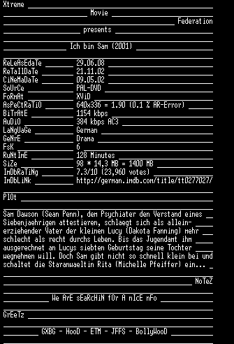 | FiLENAME: | Ich.bin.Sam.German.2001.AC3.DVDRiP.iNTERNAL.XViD-XMF.CD2.avi |