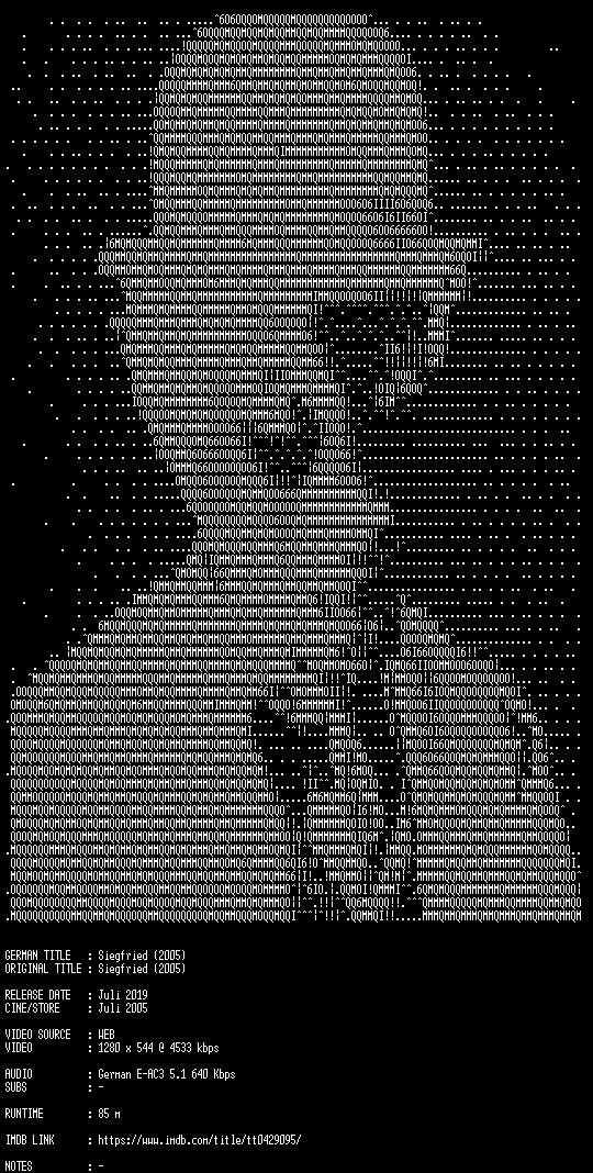 | FiLENAME: | Siegfried.2005.German.720p.WebHD.x264-CLASSiCO_iNT.mkv |