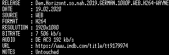 | FiLENAME: | Dem.Horizont.so.nah.2019.GERMAN.1080P.WEB.H264-WAYNE.mkv |
