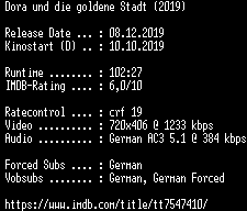 | FiLENAME: | Dora.und.die.goldene.Stadt.German.2019.AC3.BDRip.x264-COiNCiDENCE.mkv |