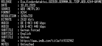 | FiLENAME: | Die.Kinderdetektei.S02E08.GERMAN.DL.720P.WEB.X264-WAYNE.mkv |