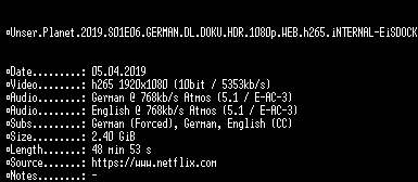 | FiLENAME: | Unser.Planet.2019.S01E06.GERMAN.DL.DOKU.HDR.1080p.WEB.h265.iNTERNAL-EiSDOCK.mkv |