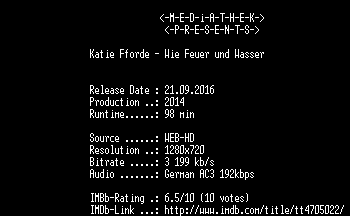 | FiLENAME: | Katie.Fforde.Wie.Feuer.und.Wasser.German.2014.720p.WebHD.h264-MEDiATHEK.mkv |