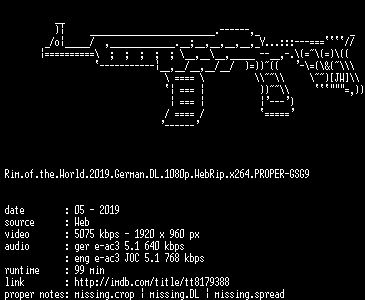 | FiLENAME: | Rim.of.the.World.2019.German.DL.1080p.WebRip.x264.PROPER-GSG9.mkv |