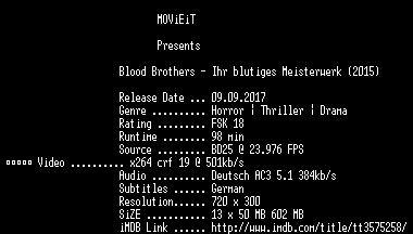 | FiLENAME: | Blood.Brothers.Ihr.blutiges.Meisterwerk.German.2015.AC3.BDRip.x264-MOViEiT.mkv |