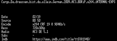| FiLENAME: | Cargo.Da.draussen.bist.du.allein.German.2009.AC3.BDRiP.x264.iNTERNAL-EXPS.mkv |