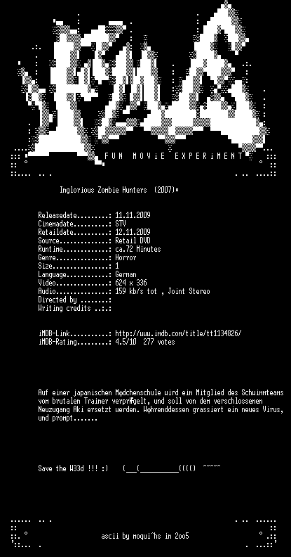 | FiLENAME: | Inglorious.Zombie.Hunters..2007.German.DVDRiP.XviD-FmE.avi |