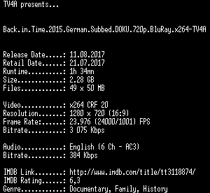 | FiLENAME: | Back.in.Time.2015.German.Subbed.DOKU.720p.BluRay.x264-TV4A.mkv |