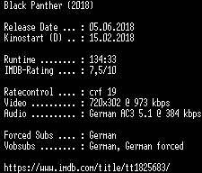 | FiLENAME: | Black.Panther.German.2018.AC3.BDRip.x264-COiNCiDENCE.mkv |
