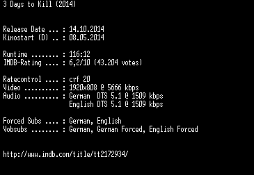 | FiLENAME: | 3.Days.to.Kill.German.DL.1080p.BluRay.x264-EXQUiSiTE.mkv |