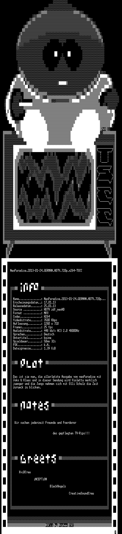 | FiLENAME: | NeoParadise.2013-01-24.GERMAN.HDTV.720p.x264-TSCC.mkv |