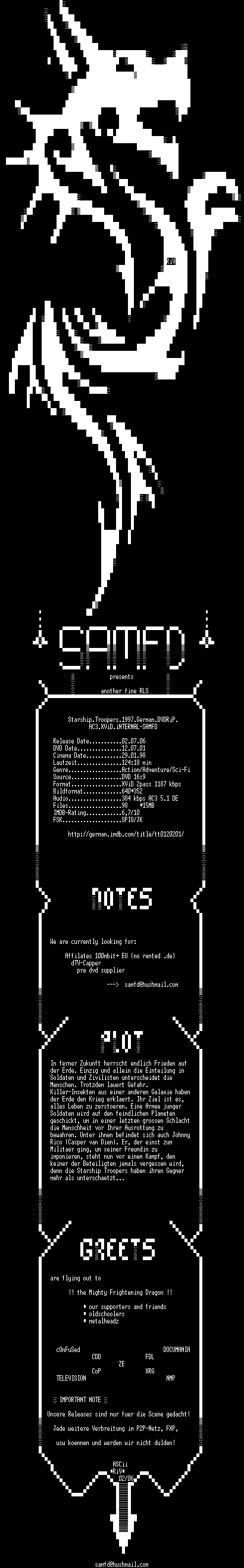| FiLENAME: | Starship.Troopers.1997.German.DVDRiP.AC3.XViD.iNTERNAL-SAMFD.CD2.avi |