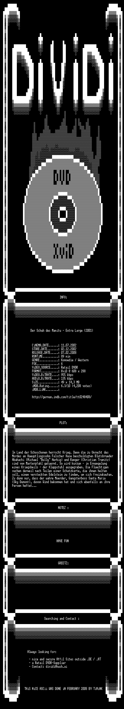 | FiLENAME: | Der.Schuh.des.Manitu.Extra.Large.German.2001.DVDRiP.XviD.iNTERNAL-DiViDi.avi |