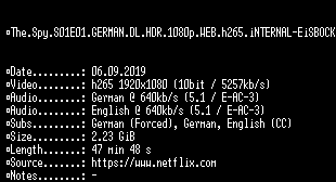 | FiLENAME: | The.Spy.S01E01.GERMAN.DL.HDR.1080p.WEB.h265.iNTERNAL-EiSBOCK.mkv |
