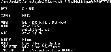 | FiLENAME: | James.Bond.007.Casino.Royale.2006.German.DL.2160p.UHD.BluRay.x265-ENDSTATiON.mkv |