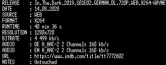 | FiLENAME: | In.The.Dark.2019.S01E02.GERMAN.DL.720P.WEB.X264-WAYNE.mkv |