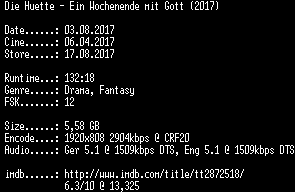 | FiLENAME: | Die.Huette.-.Ein.Wochenende.mit.Gott.2017.German.DL.DTS.1080p.BluRay.x264-CiNEViSiON.mkv |