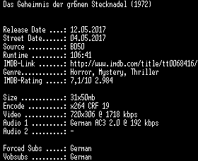 | FiLENAME: | Das.Geheimnis.der.gruenen.Stecknadel.German.REMASTERED.1972.AC3.BDRip.x264-SPiCY.mkv |