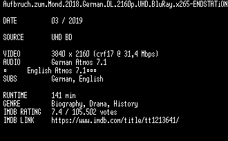 | FiLENAME: | Aufbruch.zum.Mond.2018.German.DL.2160p.UHD.BluRay.x265-ENDSTATiON.mkv |