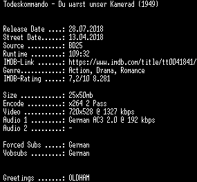 | FiLENAME: | Todeskommando.Du.warst.unser.Kamerad.German.REMASTERED.1949.AC3.BDRip.x264-SPiCY.mkv |