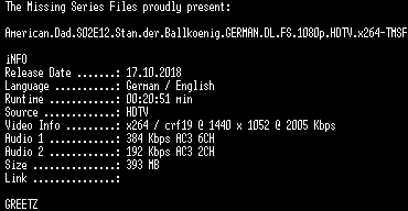 | FiLENAME: | American.Dad.S02E12.Stan.der.Ballkoenig.GERMAN.DL.FS.1080p.HDTV.x264-TMSF.mkv |