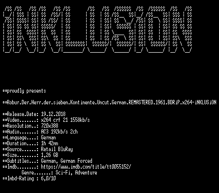 | FiLENAME: | Robur.Der.Herr.der.sieben.Kontinente.Uncut.German.REMASTERED.1961.BDRiP.x264-iNKLUSiON.mkv |