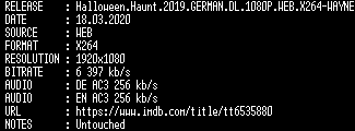 | FiLENAME: | Halloween.Haunt.2019.GERMAN.DL.1080P.WEB.X264-WAYNE.mkv |