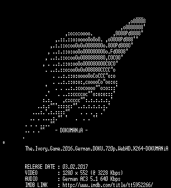 | FiLENAME: | The.Ivory.Game.2016.German.DOKU.720p.WebHD.X264-DOKUMANiA.mkv |