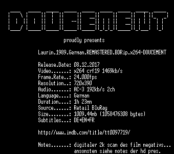 | FiLENAME: | Laurin.1989.German.REMASTERED.BDRip.x264-DOUCEMENT.mkv |