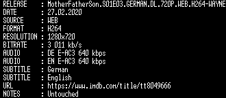 | FiLENAME: | MotherFatherSon.S01E03.GERMAN.DL.720P.WEB.H264-WAYNE.mkv |