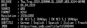 | FiLENAME: | The.Trap.2019.GERMAN.DL.1080P.WEB.X264-WAYNE.mkv |