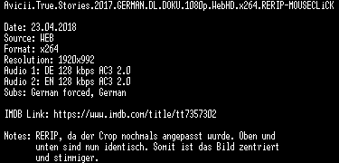 | FiLENAME: | Avicii.True.Stories.2017.GERMAN.DL.DOKU.1080p.WebHD.x264.RERIP-MOUSECLiCK.mkv |