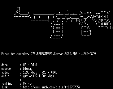 | FiLENAME: | Parasiten.Moerder.1975.REMASTERED.German.AC3D.BDRip.x264-GSG9.mkv |
