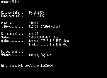 | FiLENAME: | Annie.2014.German.DL.1080p.BluRay.x264-EXQUiSiTE.mkv |