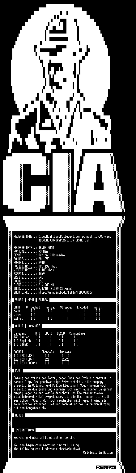 | FiLENAME: | City.Heat.Der.Bulle.und.der.Schnueffler.German.1984.AC3.DVDRiP.XViD.iNTERNAL-CiA.CD2.avi |
