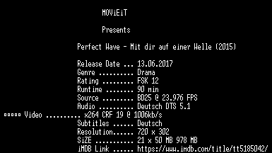 | FiLENAME: | Perfect.Wave.German.2015.BDRiP.x264-MOViEiT.mkv |