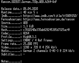 | FiLENAME: | Ransom.S02E07.German.720p.WEB.h264-WvF.mkv |